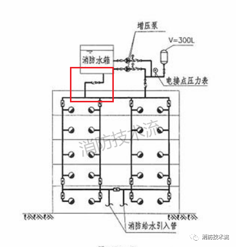 高位消防水箱的主要作用是供給建筑初期火災時的消防用水水量,當消防水滅火系統例如室內消火栓系統的穩壓裝置設置在高位時,因高位消防水箱經過穩壓裝置與消防管網連接,容易漏設高位水箱的并聯重力出水管(如下圖)。