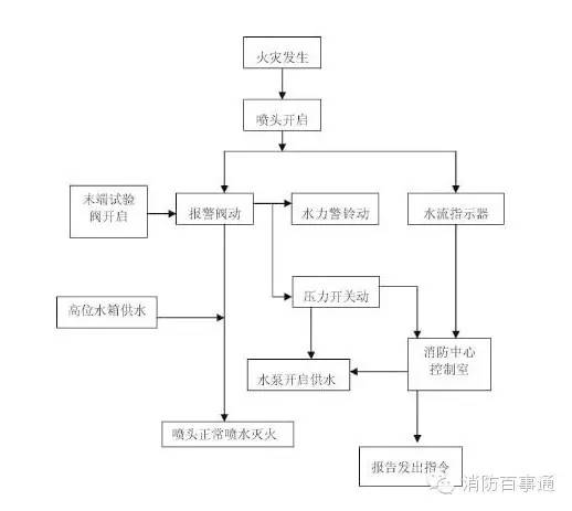 當(dāng)自動(dòng)噴淋滅火系統(tǒng)的保護(hù)區(qū)域內(nèi)發(fā)生火情時(shí),火場(chǎng)環(huán)境溫度升高,閉式噴頭上的玻璃球破裂(或易熔合金熔化),噴頭打開噴水滅火。此時(shí)由于濕式報(bào)警閥出口側(cè)管網(wǎng)水壓下降,形成壓差,閥瓣組件打開,供水側(cè)水源水不斷補(bǔ)充管網(wǎng)滅火,同時(shí)水流也經(jīng)密封環(huán)槽內(nèi)的孔流入延遲器,并迅速充滿,以一定水壓沖擊水力警鈴發(fā)出連續(xù)的報(bào)警聲,壓力開關(guān)動(dòng)作接通電觸點(diǎn),并將信號(hào)反饋至控制中心,以聲、光報(bào)警,同時(shí)啟動(dòng)主供水泵進(jìn)行消防滅火。