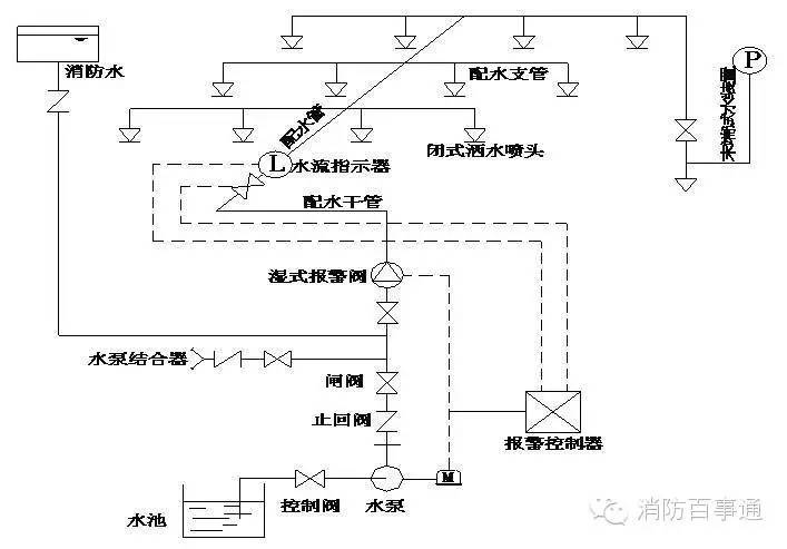 由噴頭、管道系統(tǒng)、濕式報(bào)警閥、報(bào)警裝置和供水設(shè)施等組成。由于該系統(tǒng)在報(bào)警閥的前后管道內(nèi)始終充滿著壓力水,故稱濕式噴水滅火系統(tǒng)或濕管系統(tǒng)。