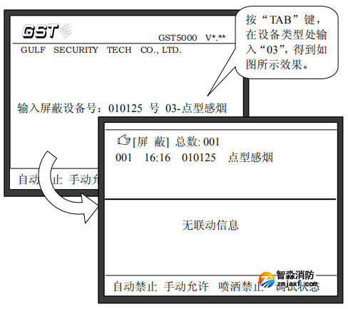 注意:在進(jìn)行消防主機(jī)“屏蔽”操作中輸入設(shè)備的編碼時(shí),可以使用通配符“*”,“*”代表這一位可以是0~9中的任意一個(gè)數(shù)字,這個(gè)功能可以方便的將一類設(shè)備取消屏蔽。例如:如果要屏蔽掉系統(tǒng)中所有的點(diǎn)型感煙火災(zāi)探測(cè)器,我們可以在屏蔽操作時(shí)輸入:“******”,“TAB”,“03”,這樣所有點(diǎn)型感煙火災(zāi)探測(cè)器將被屏蔽。其中“03”為點(diǎn)型感煙火災(zāi)探測(cè)器設(shè)備類型代碼。
